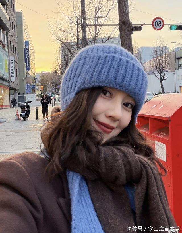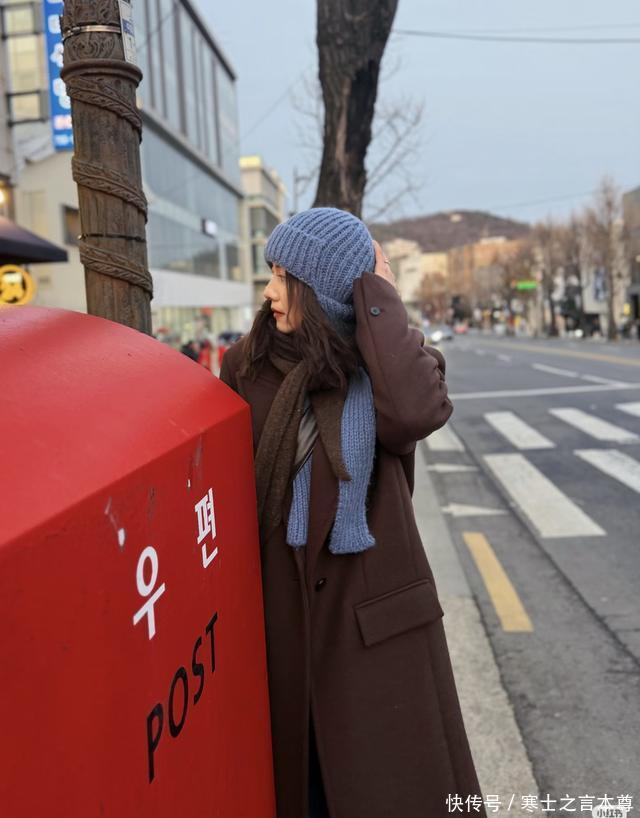 另一套棕色长款大衣是重头戏,内搭蓝色牛仔裤,配上同色系的蓝色针织帽和围巾,棕蓝撞色高级又不沉闷,大衣长度到脚踝,把寒风挡得严严实实,走在首尔的小巷里,踩着平底鞋也丝毫不影响气场,慵懒又精致。